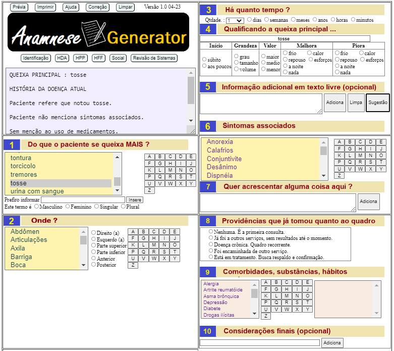 mostrada na tela e o sistema vai montar a anamnese automaticamente.